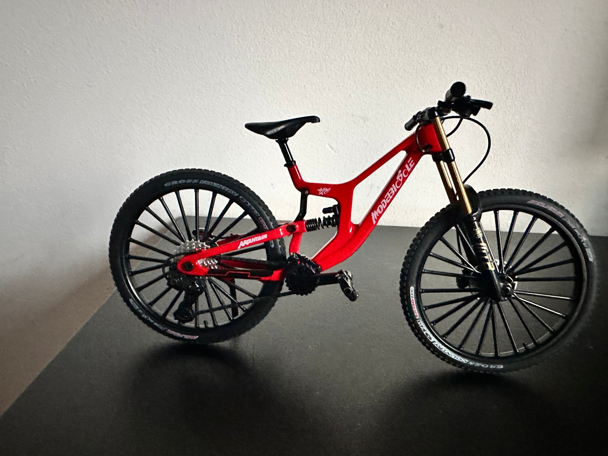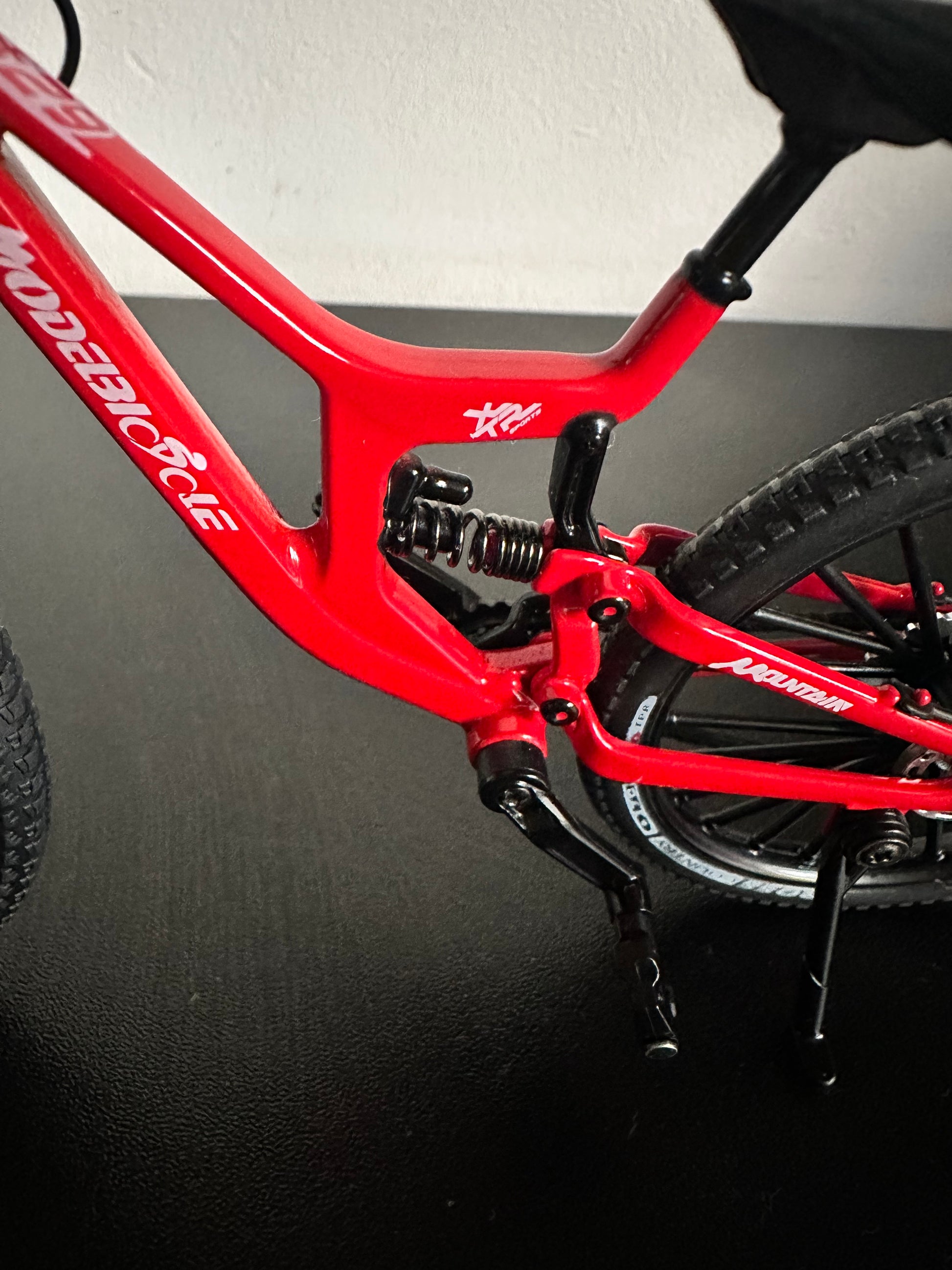 Realistyczny miniaturowy rower z przednim i tylnym zawieszeniem, ruchomym napędem i detalami jak w prawdziwym MTB. Idealny jako gadżet, prezent albo dekoracja dla fanów kolarstwa.